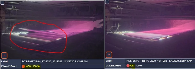 Exemple de détection d’un défaut de forme de la tête de bande affichée NOK sur l’image de gauche, en comparaison avec une tête de bande sans défaut, illustrée à droite.